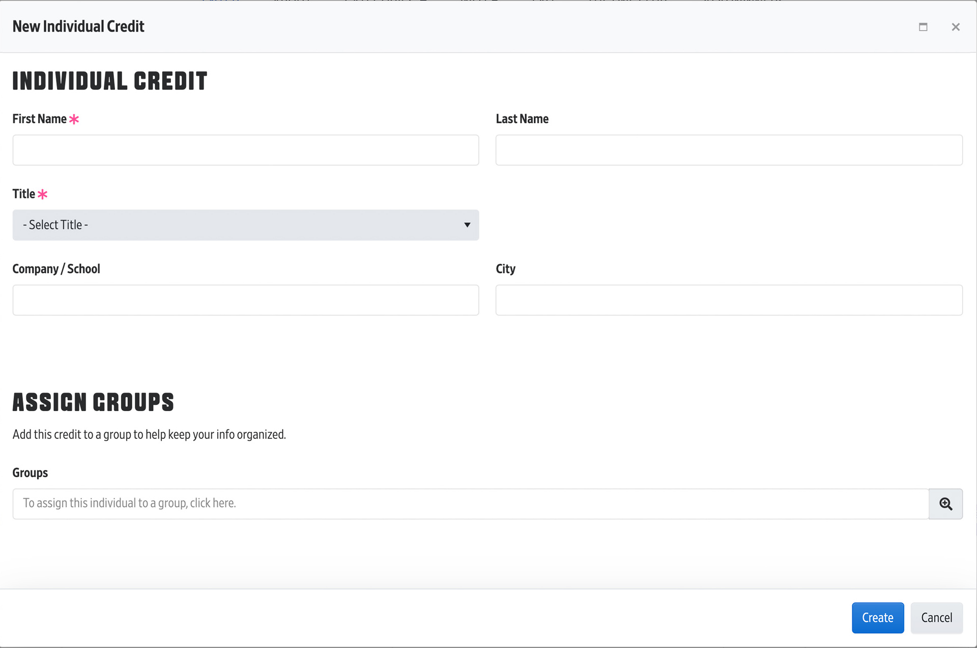 - First Name and Title are required for each individual credit. Last Name is optional, but highly recommended.